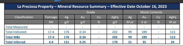Mineral resources for La Preciosa are estimated at a cut-off grade of 120 g/t AgEq.