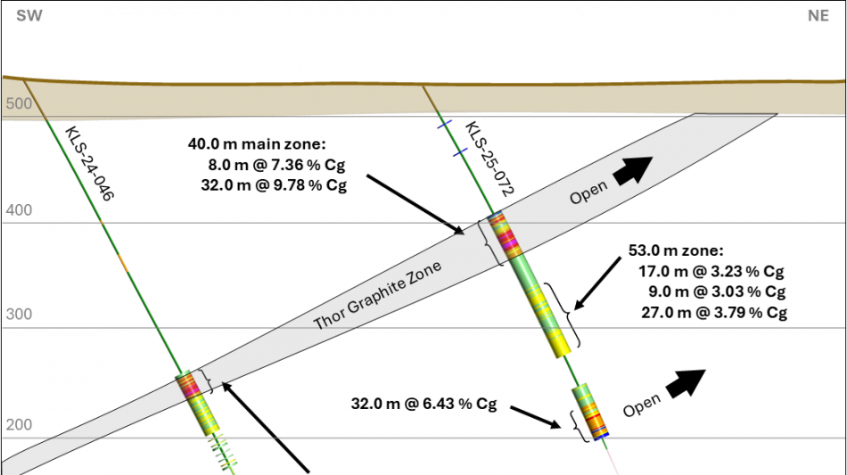 Figure 3: Cross-section A, looking northwest, of the Thor Graphite Zone showing graphite mineralization in KLS-25-072 (this release), approximately 350 m up-dip of KLS-24-046.