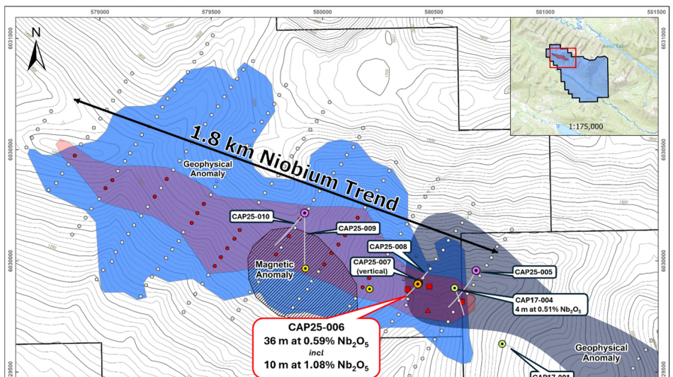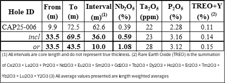 Preliminary visual results from drillhole CAP25-006 of the 2025 campaign motivated the Company to request a rush order for the results from the upper 72.5 metres ("m") from the assay lab. The results confirm strong niobium mineralization starting at 33.5 m downhole with 36 m at 0.59% Nb₂O₅, including a higher-grade zone of 10 m averaging 1.08% Nb₂O₅ (see Table 1, Figure 1). These results validate the strong visual estimates of pyrochlore mineralization (Figure 2) reported in the Company's August 12 news release and demonstrate the grade potential over significant thickness at depth, where the heart of the mineralized system remains untested.