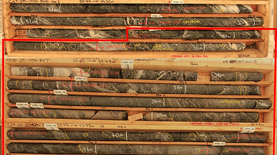 Figure 2. CAP25-006 - CAP25-006 - Abundant pyrochlore observed between 38 and 41 m, a ~3 m section within the broader interval that assayed 1.08% Nb₂O₅ over 10 m