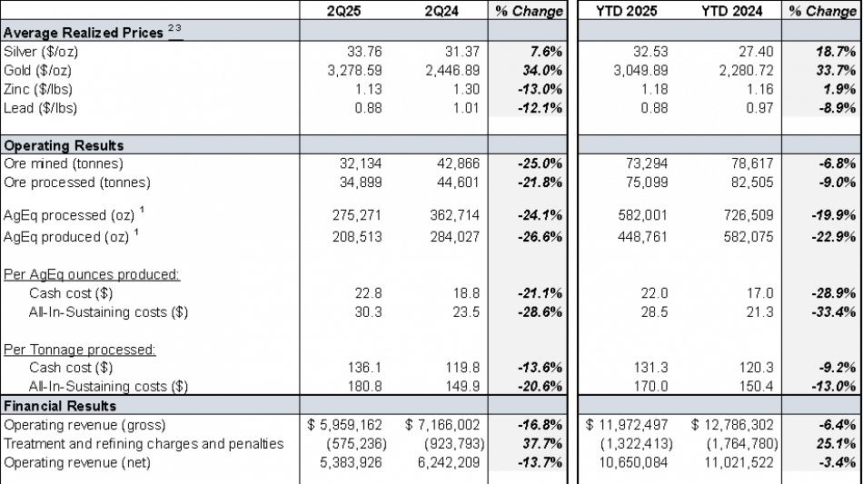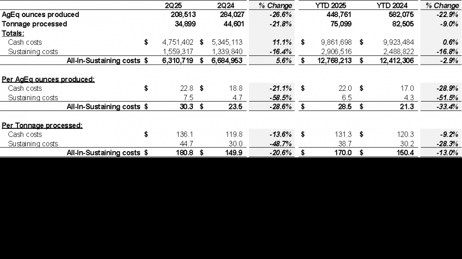 Average AgEq head grades declined by 3.0% in 2Q25 compared to 2Q24, and by 12.0% for the six months ended June 30, 2025, versus the same period in 2024.