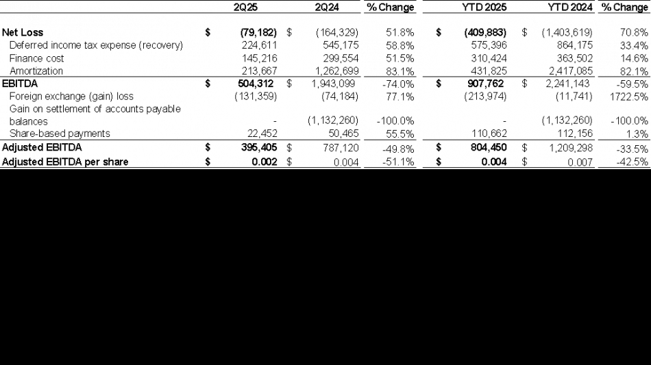 EBITDA declined to $0.5M compared to $1.9M reported in 2Q24, representing a 74% decrease over the same period one year ago (refer to Non-IFRS Financial Measures).
