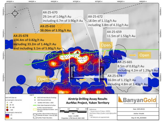 VANCOUVER, BC / ACCESS Newswire / September 4, 2025 / Banyan Gold Corp. (the "Company" or "Banyan") (TSXV:BYN)(OTCQB:BYAGF) is pleased to announce it has intersected 104.4 metres ("m") at 0.82 g/t Au including 33.2m at 1.44 g/t Au and 3.1m at 5.8 g/t Au in drillhole AX-25-678 at the southern extent of the Airstrip Deposit ("Airstrip") at its AurMac Project ("AurMac") in the prolific Tombstone Belt, Yukon, Canada. This drillhole highlights the potential for Airstrip mineralization to extend below Powerline and bridge the gap between the conceptual pits. In addition, drill results indicate potential extensions to the mineralized envelope at Airstrip, east and southeast of the Mineral Resource Estimate ("MRE") (Table 3) conceptual pit, as well as a step out east of Airstrip demonstrates near-/at-surface high-grade mineralization (Figure 1). To date, over 27,000m (120 holes) have been drilled by the Company this year on the AurMac Project, with drilling currently ongoing.