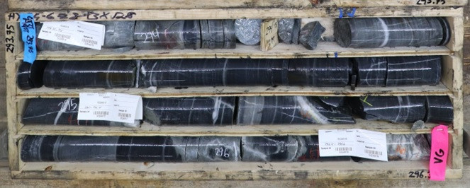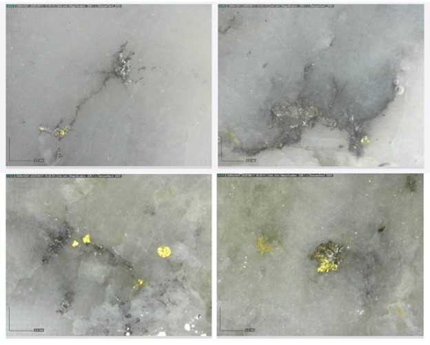 Figure 4: Visible Gold intergrown with Arsenopyrite and fine-grained Bismuth Sulphosalt in drill hole AX-25-678 in sheeted veins at 296.3m.