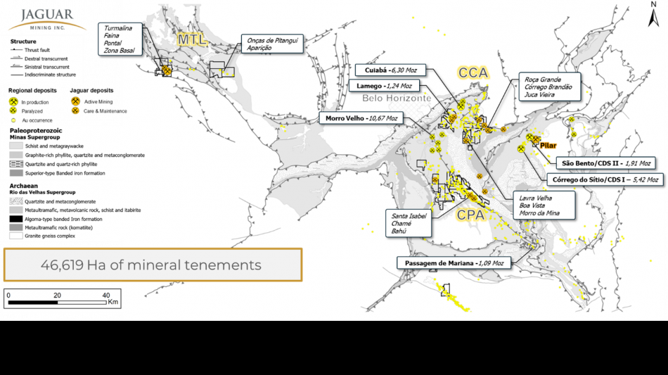 Jaguar Mining Inc. is a Canadian-listed junior gold mining, development, and exploration company operating in Brazil with three gold mining complexes and a large land package with significant upside exploration potential from mineral claims. The Company's principal operating assets are located in the Iron Quadrangle, a prolific greenstone belt in the state of Minas Gerais and include the MTL complex (Turmalina mine and plant) and Caeté complex (Pilar and Roça Grande mines, and Caeté plant). The Roça Grande mine has been on temporary care and maintenance since April 2019. The Company also owns the Paciência complex (Santa Isabel mine and plant), which had been on care and maintenance since 2012 and is under review to restart in 2026. Additional information is available on the Company's website at www.jaguarmining.com.