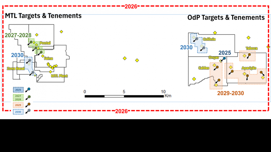 Figure 3: Sketch of the planned sequence of exploration work at the MTL Complex and Onças de Pitangui Project over the next five years.