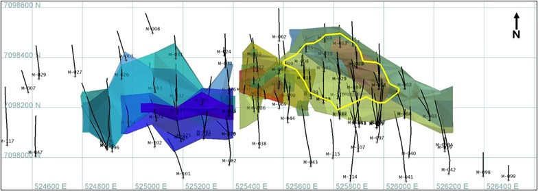 Classification approach remains unchanged from 2016 and uses a pragmatic and repeatable approach. The blocks that were estimated in the first pass with 3 drill holes within a 90 m by 60 m search pattern were used as a guide to defining the area of consistent drill coverage suitable for Indicated Mineral Resource classification. This was applied, to only the eastern upper and eastern lower outer high grade zones that demonstrate continuity, by digitising in the extent of the area and applying it to blocks in the dominant domains (Figure 6).