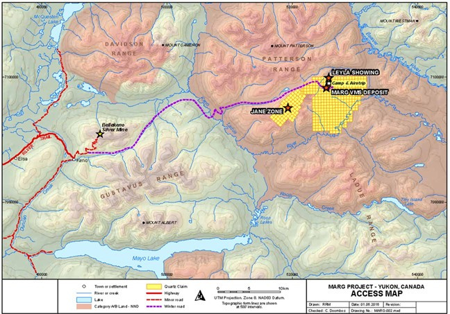 The Marg Property is a volcanogenic massive sulphide (VMS) deposit located in the Central Yukon, approximately 40 km east of Keno City. According to the property's claims history, Azarga acquired a 100% interest in the 400 mineral claims, which cover approximately 8,400 hectares, in July 2025 (Figure 1).