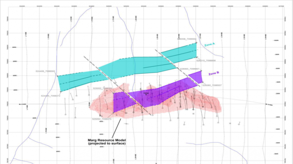 The most recent geophysical work completed by the company included an induced polarization survey (Figure 5), which identified an additional zone of interest at the Marg Project. Zone A, lying to the north of Zone B (the current Mineral Resource), and is interpreted as the probable "up-dip", near surface mineralized Marg horizon.
