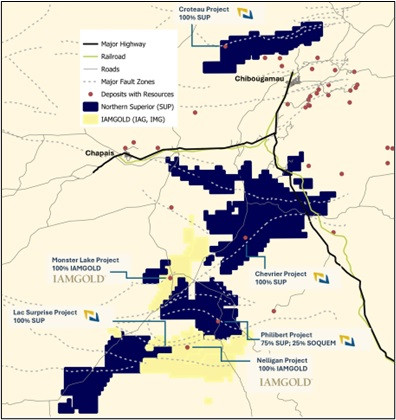Northern Superior is a gold exploration company focused on the Chibougamau Camp in Québec, Canada. The Company has consolidated the largest land package in the region, with total landholdings currently exceeding 70,000 hectares. The main properties include Philibert, Hazeur (adjacent to Philibert), Lac Surprise (adjacent to Nelligan), Chevrier, Croteau, Monster Lake East, and Monster Lake West. Northern Superior also owns 56% of ONGold Resources Ltd. (TSXV:ONAU)(OTCQB:ONGRF) which is advancing promising exploration assets in Northern Ontario and Manitoba, including the district scale TPK Project and Monument Bay; Agnico Eagle Mines Limited owns 15% of ONGold Resources Ltd.