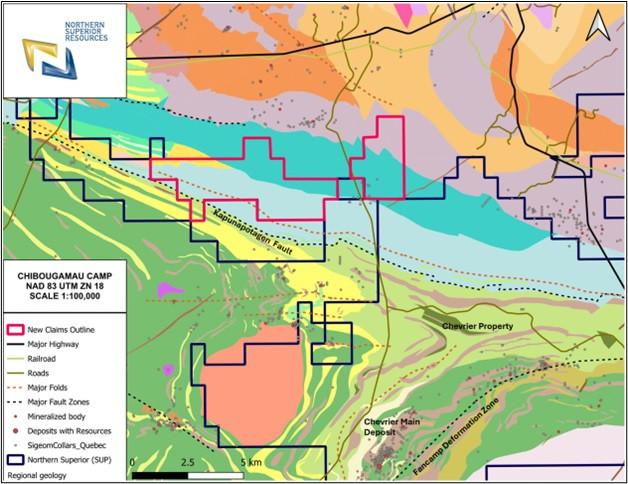 The Company has also expanded its land position through the acquisition of 38 new map-designated claims (CDC) covering more than 2,100 hectares contiguous to the north of the Chevrier property (see Figure 2 and Figure 3). These claims straddle the Chapais Syncline, a large and underexplored sedimentary-volcanic basin unconformably overlying the Roy Group. The syncline is cut by the Kapunapotagen Fault Zone, a major reverse shear corridor known to act as a conduit for mineralizing fluids. Despite its favorable geological setting, the area has seen very limited systematic exploration to date, as evidenced by the sparse detail on the geological map and very limited drilling (SeeFigure 3). Northern Superior's geological team has already initiated reconnaissance work, including mapping and the collection of 80 surface samples, with results pending.