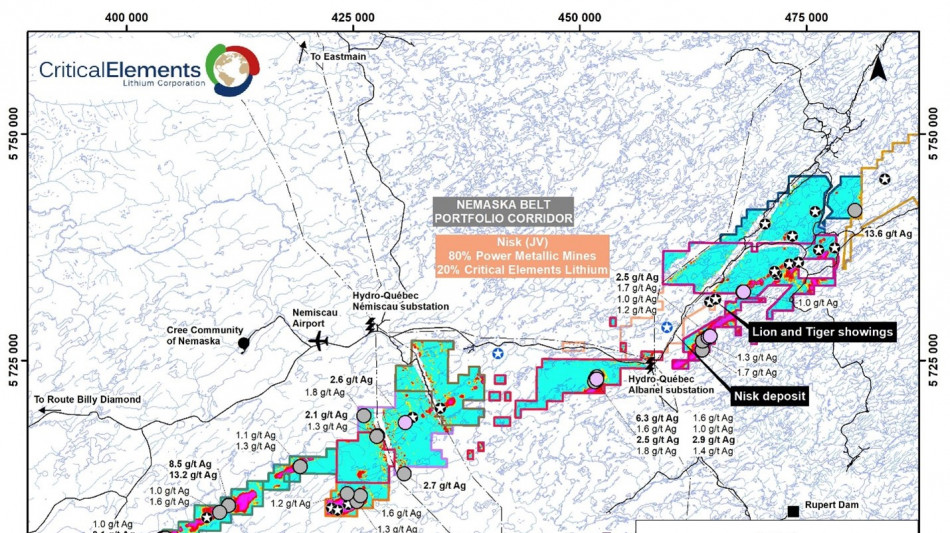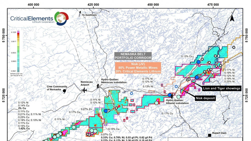 Interest in high-grade nickel-copper-PGE mineralization in the region has increased with the exploration success of Power Metallic Mines Inc. ("Power Metallic"), formerly Chilean Metals Inc. Critical Elements optioned the Nisk property to Power Metallic in 2020 (press release). Following the exercise of the option agreement by Power Metallic on the property hosting the Ni-Cu-EGP Nisk deposit and the new polymetallic Lion discovery, Critical Elements retains a non-dilutive interest of 20% until a definitive feasibility study regarding extraction and production activities is completed on the Nisk property. Critical Elements also held just over 10 million shares of Power Metallic as of May 31, 2025 (Condensed Interim Financial Statements for the nine-month period ending May 31, 2025).