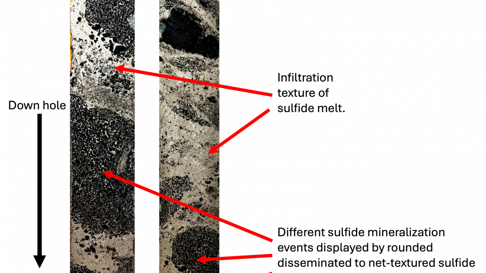 Figure 4: Core from drill hole IM2025-01 at the HGR deposit area at Iron Mountain - Net-textured to semi-massive mineralization displaying sulfide liquid percolation textures is shown from around 417m depth.