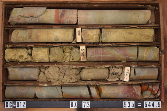 The high-grade silver intercepted in hole GC-012 between 164.0 to 165.2 m (538 and 542 feet, see photo below) appears to be associated with a clay-rich alteration zone of the Winnipeg Formation. Core above and below this mineralized intercept is currently being assayed.