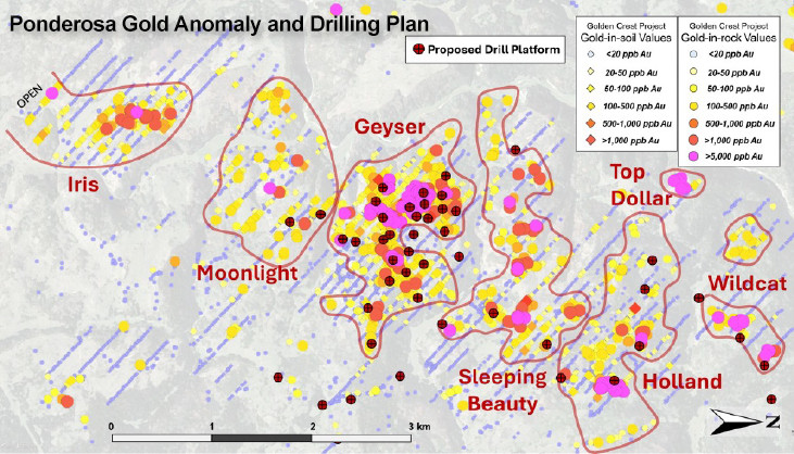 Phase 2 drilling on the Ponderosa side of the Golden Crest property is set to begin as soon as permits are received. We are awaiting the U.S. Forest Service's final decision and are targeting a late-October start. With drilling permitted between May 15 and December 15, the upcoming program will provide an excellent opportunity to further advance Golden Crest. Building on the strong results from Phase 1, the Ponderosa Plan of Operations includes more than 40 drill hole locations (see map below), offering significant potential for new discoveries.