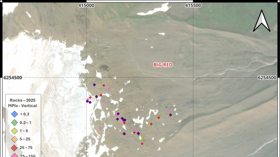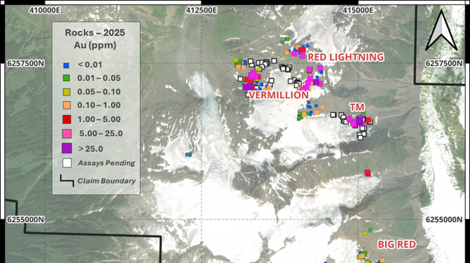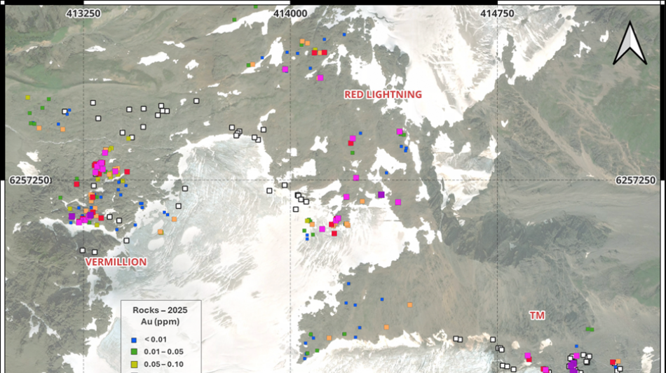 The 2025 exploration program at the Eskay Project includes extensive surficial sampling, reconnaissance geological mapping, and channel sampling across target areas around the Unuk Finger Mountain with the goal of advancing early-stage prospects into drill ready targets. A total of 298 rock sample and 29 channel sample assays have been received to date with further sampling ongoing on the Vermillion, TM and Big Red zones. In addition, a Worldview 3 high-resolution satellite imagery survey has been collected across the property with results expected later this month. Hyperspectral imaging and detailed orthophotos will help support focused exploration efforts across Eskay's 200 km2 project area.
