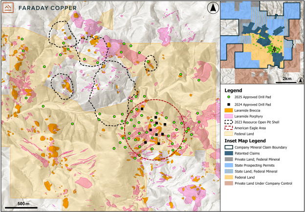 The recently approved Exploration Plan of Operations by the Bureau of Land Management includes up to 67 drill pads located on Federal land, 48 of which are in or near the American Eagle area (Figure 1). This approval substantially increases the opportunities for drill targeting the American Eagle area compared to the previously available nine drill pads. Phase III drilling from these nine drill pads identified several mineralized breccias in the American Eagle area, including the high-grade Banjo breccia. The additional approved pads will allow testing for further near-surface porphyry and breccia-hosted mineralization near American Eagle. Some drilling will be aimed at the collection of geotechnical and hydrological data. A combined total of approximately 20,000 m of drilling is allocated to these objectives.