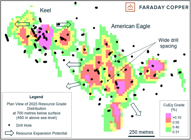 The American Eagle underground resource contains high-grade cores that may correspond to magmatic cupola zones or high-grade breccias. The underground resource at both Keel and American Eagle are open laterally and additional drilling has the potential to expand the mineralization and further define high-grade mineralization (Figure 5). Some drilling will be aimed at reconnaissance drilling for potential new porphyry centres. Approximately 10,000 m of drilling is allocated to these objectives.