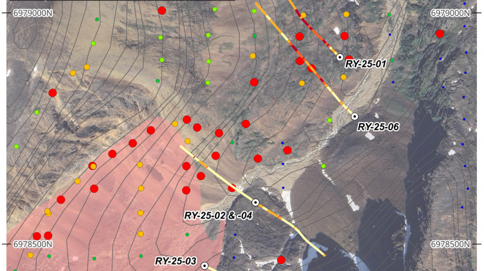 A total of six holes were completed, with visual observations from the first three holes previously announced on August 28, 2025. All six holes were directed toward zones of densely sheeted quartz-tourmaline±arsenopyrite veins, located in and around the reduced, mid-Cretaceous Itsi Pluton (Figure 1). Hole RY-25-01 cut a 224 m wide zone (from surface) of hornfels hosting an abundance of sheeted quartz-pyrrhotite-chalcopyrite±arsenopyrite±scheelite veins, with measured vein densities averaging 15 per metre, including broad areas with vein densities greater than 25 per metre. The final hole of the program, RY-25-06, was collared about 130 m behind, and south of RY-25-01 and was designed to better assess the width and down-dip extent of the sheeted veins. Hole 25-06 cut a 210 m wide zone with measured vein densities averaging 13 per metre. Drill hole specifics for all holes completed in 2025 are listed in the table below.