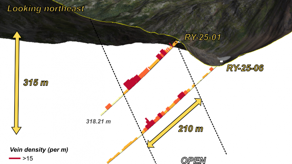 Step-out hole RY-25-06 intersected 210 m of hornfels with an average sheeted vein density of 13 per metre, extending the zone of abundant veining along strike and down-dip