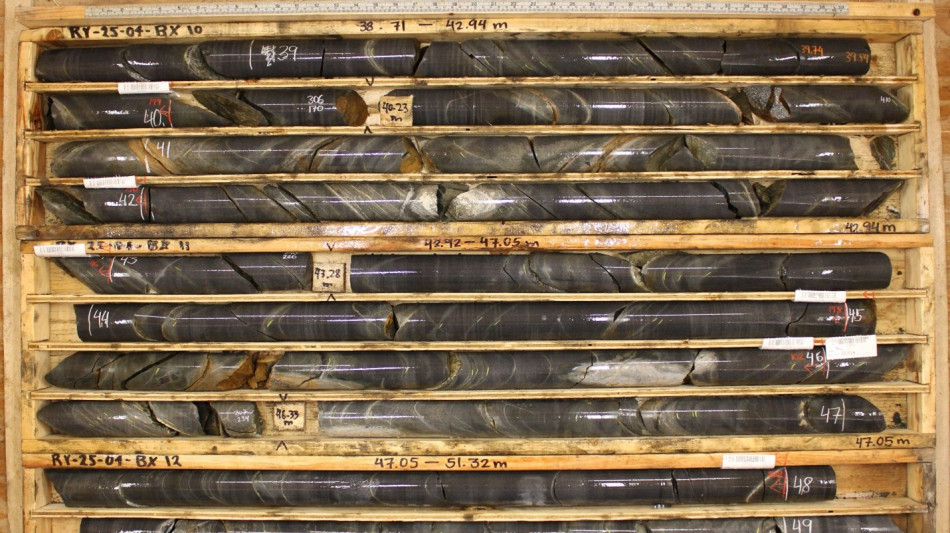 Figure 4 - Drill core from hole RY-25-04, between 38.71 and 51.32 m, where the average measured sheeted vein density is 7 per metre comprising qtz-pyrite+/-carbonate and qtz-pyrite-pyrrhotite