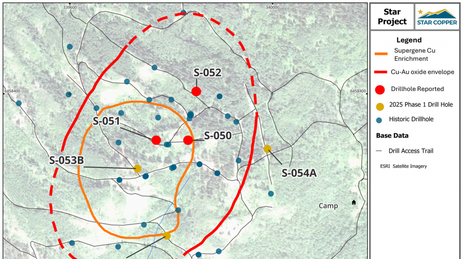 In summary, the initial Phase 1 results from drill holes S-050, S-051 and S-052 confirm a broad near-surface supergene copper enrichment blanket at Star Main covering 300 x 250 m to a depth of 100 m, with multiple intervals at or above the analytical upper limit of 10,000 ppm Cu (≥1.00% Cu; minimum values are pending over-limit re-assay).