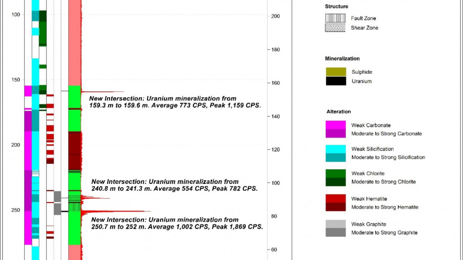 2The Company considers high-grade mineralization to be any interval with radioactivity derived from downhole gamma probe >10,000 CPS. The total gamma results provided were selected using an average cutoff of 500 CPS over intervals of 0.1 metre width. All drill intercepts are core width and true thickness is yet to be determined.