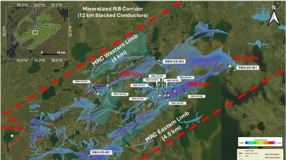 Along the parallel western limb of the MRC, the Company has intersected mineralization over an additional ~4.0 km with drillhole RIBW-DD-003, located ~1.5 km to the north of RIBW-DD-002 (See Sept. 18, 2025, News Release) (Figure 2);