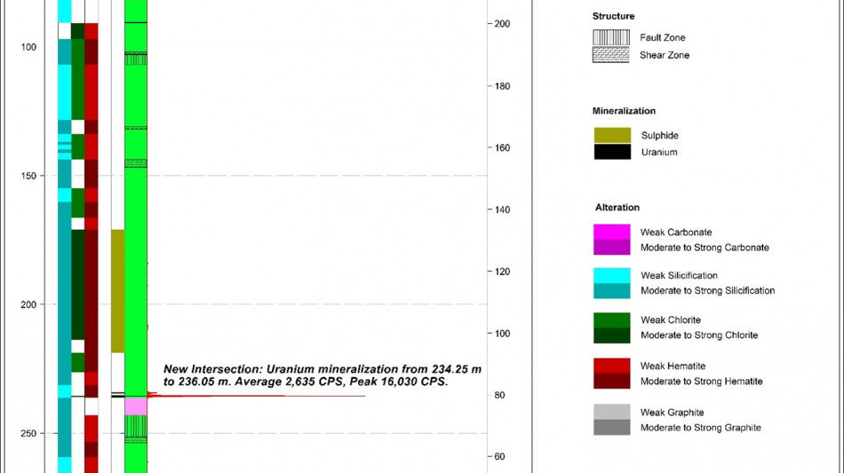 Along the western limb of the MRC, one additional drillhole, RIBW-DD-003, located ~1.5 km from RIBW-DD-002 (See Sept. 18th, 2025, News Release) has been completed. Drillhole RIBW-DD-003, intersected continuous uranium mineralization over 1.8 m including 0.2 m of high-grade mineralization2. The mineralized interval intersected between 234.15 m and 235.98 m had an average radioactivity of 2,635 CPS1 and a peak of 16,030 CPS1 (Figure 5).