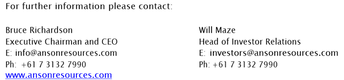 Forward Looking Statements: Statements regarding plans with respect to Anson's mineral projects are forward looking statements. There can be no assurance that Anson's plans for development of its projects will proceed as expected and there can be no assurance that Anson will be able to confirm the presence of mineral deposits, that mineralisation may prove to be economic or that a project will be developed.