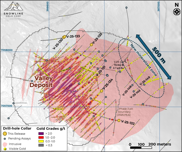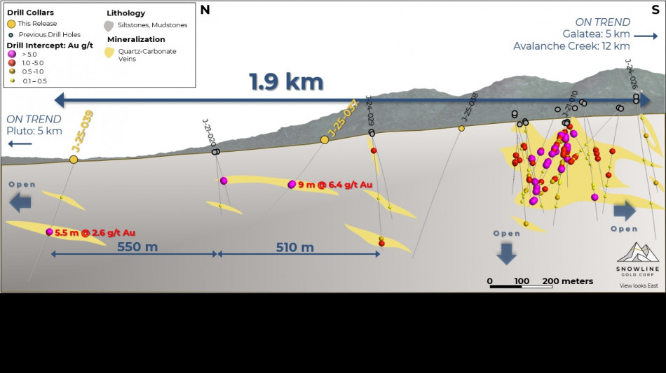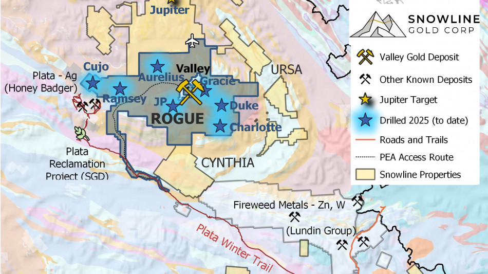 VANCOVER, BC / ACCESS Newswire / September 24, 2025 / SNOWLINE GOLD CORP. (TSXV:SGD)(US OTCQB:SNWGF) (the "Company" or "Snowline") is pleased to announce additional drill results from ongoing exploration at its Rogue and Einarson projects in the eastern Yukon Territory. Drilling at Jupiter, an orogenic gold discovery on Snowline's 100%-owned Einarson Project, extends the known strike length of gold mineralization by roughly 550 m to 1.9 km (Figure 1). Drill results within a 500 m gap in previous drilling returned 6.82 g/t Au over 9.0 m from 179.5 m downhole in hole J-25-037. The gold system at Jupiter remains open along strike in both directions and to depth. At Snowline's flagship Valley gold deposit on the Rogue Project ("Valley"), infill and expansion drilling continue to confirm and expand the scale of known mineralization. To date, over 28,500 m have been drilled by the Company this year on the Rogue and Einarson projects, with drilling ongoing and assays pending for approximately 20,000 m. The 2025 exploration program is complemented by extensive engineering and environmental fieldwork at Valley to inform future studies and permitting efforts.