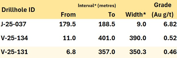 Jupiter is an epizonal orogenic gold discovery roughly 30 km north of Valley. Of the six holes reported herein, three were drilled within the main NNW-SSE corridor where mineralization has been encountered to date. Two of these holes were drilled in large untested gaps in previous drilling, with hole J-25-037 intersecting a highlight interval of 6.82 g/t Au over 9.0 m (Figure 2). The third such hole, J-25-039, was collared roughly 440 m north of previous holes and considerably expands the footprint of known mineralization at Jupiter which now extends roughly 1.9 km (Figure 1). The gold system at Jupiter remains open along strike and to depth.