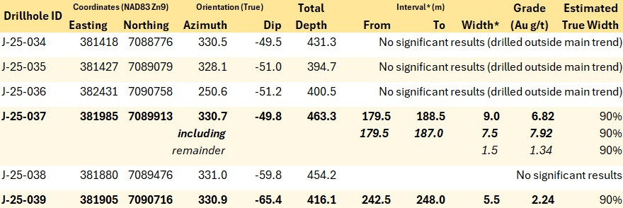 Continuity of mineralization highlighted by hole J-25-037, with 9.0 m at 6.82 g/t Auwithin a >500 m gap in previous drilling at Jupiter