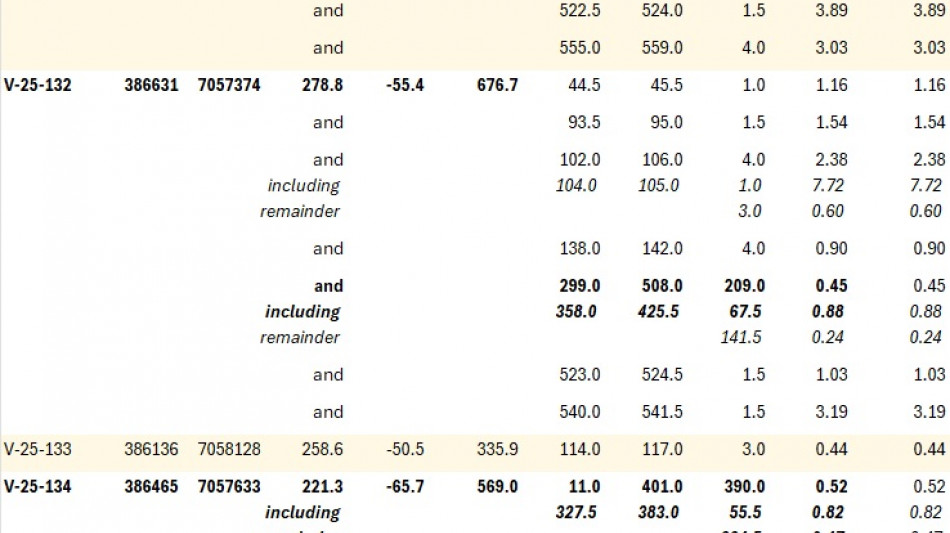 The Company has received results from six additional holes at Valley. These holes, V-25-130 through 135, continue to encounter broad zones of anomalous gold mineralization outside of the current Valley MRE and PEA mine plan. Hole V-25-132, for example, returned 209.0 m at 0.45 g/t Au, including 67.5m at 0.88 g/t Au, roughly 70 m southeast of the PEA mine plan. Where inside the existing block model, results will serve to inform potential recategorization of Inferred Mineral Resources (Figure 3, Table 3).