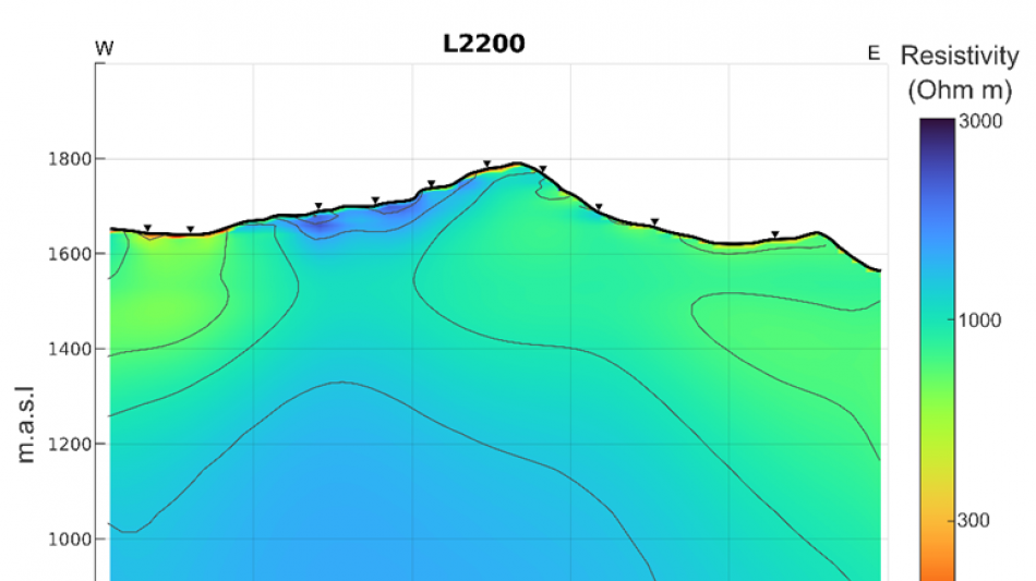 Figure 1: 3D MT resistivity cross-section (Line 2200N) modelled using Viridien's RLM-3D inversion. The prominent high-resistivity anomaly (blue zones) extends from ~1,000 m depth to surface beneath the area of known fenite dykes. This deep resistive body is interpreted as a potential carbonatite intrusion associated with REE mineralisation. (Vertical axis in metres; horizontal axis in metres along line.)