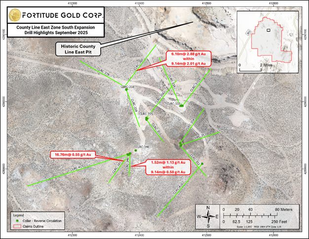"This County Line East zone drill program consistently intercepted significant intervals expanding oxide gold mineralization at and near surface," stated Mr. Allan Turner, Vice President of Exploration for Fortitude Gold. "Additional backlogged assays from this drill program are forthcoming, but these results demonstrate gold mineralization at the East zone remains open. We look forward to future drill programs to potentially continue mineralization expansion, assist in mine development, as well as adding additional gold resources at the County Line property."