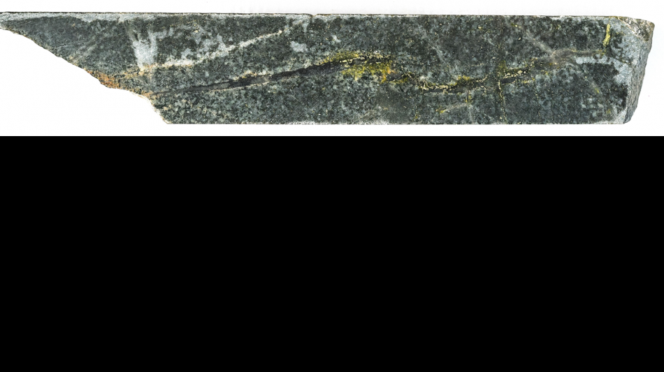 Chalcopyrite, most pronounced in the darker, finer-grained QMD phases, was localized to quartz sulphide veins and vein halo dissemination. Importantly for our geologic model, post-logging core review identified early quartz-actinolite-pyrite-epidote veins carrying chalcopyrite and including replacement of mafic grains into the vein halos (0.5-1 cm scale). These textures indicate a sustained hypogene fluid system and anchor the potassic corridor trending west from S-056.