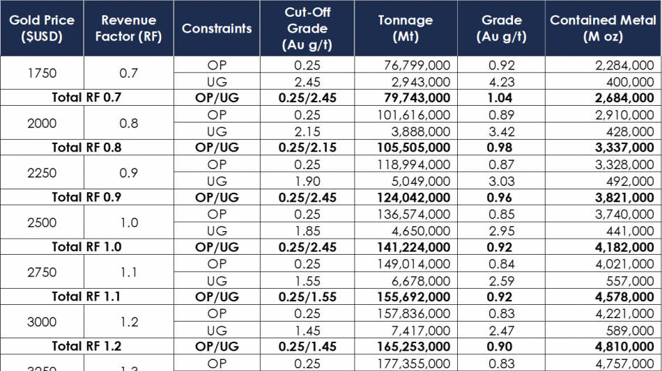 3.17 million inferred ounces gold at 0.89 gram per tonne (gpt or g/t) gold 1.01 million indicated ounces gold at 0.98 gpt gold using long term gold price of US$2500/oz (see Table 1 and note 1)