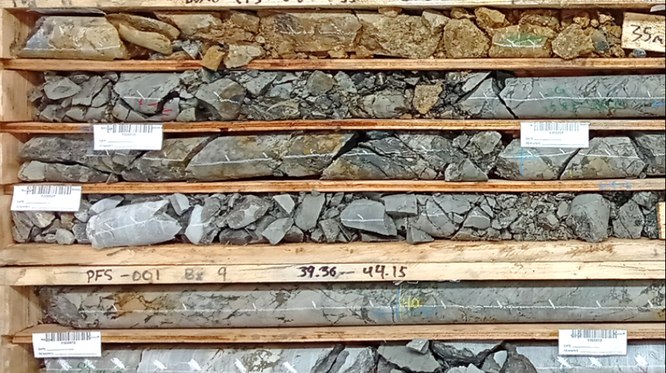 The drill hole is interpreted to have intersected one of a series of faults that bound the central graben to the north and offset the stratigraphy downward to the south. Two styles of mineralization are present within PFS-001: stratabound at a depth of approximately 83m and intermittent fault-hosted at a downhole depth of 92m. The copper sulphide mineralization is hosted within a thick sequence of fractured and brecciated dolomudstones of the Allen Bay Formation.