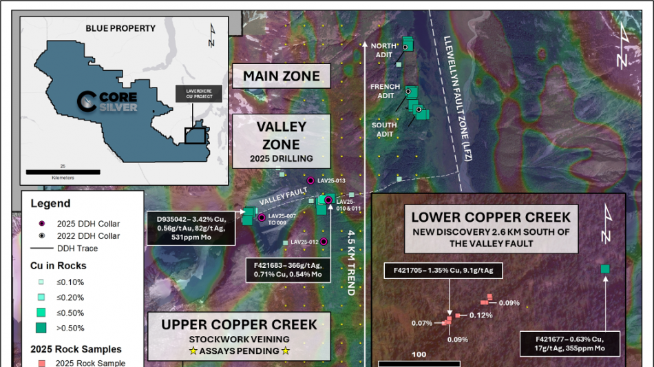 VANCOUVER, BC / ACCESS Newswire / October 20, 2025 / Core Silver Corp. ("Core Silver" or the "Company") (CSE:CC)(FSE:8ZR)(OTCQB:CCOOF) is pleased to confirm the discovery of a new copper-bearing porphyry vein system at Copper Creek, part of the Laverdiere Copper Project (the "Project"), located on the eastern side of the Company's Blue Property (the "Property") in the Atlin Mining District of northwestern British Columbia.
