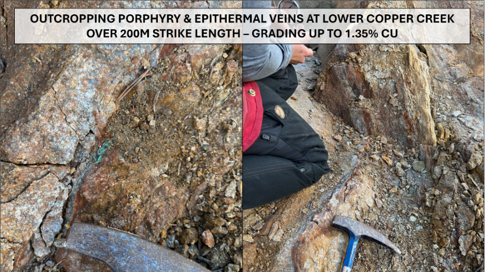 Steeply dipping malachite-chalcopyrite-bearing veins and fractures at Copper Creek are locally cross-cut by epithermal-style quartz-carbonate veining, indicating the presence of a multi-phase, robust hydrothermal system.
