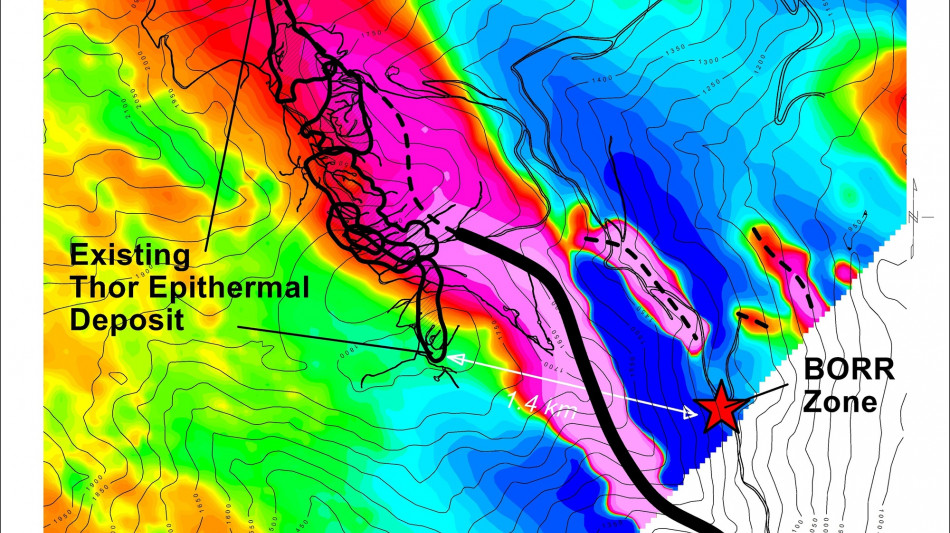 The Thor-255 epithermal intercept is the only known substantive occurrence of mineralization outside of the existing Thor NI 43-101 Mineral Resource, and it occurs on the east side of a positive aeromagnetic feature. The entire existing Thor NI 43-101 Mineral Resource occurs on the west side of the aeromagnetic feature. The Thor epithermal deposit may form an inverted 'horseshoe-shaped' feature around the aeromagnetic anomaly. Our prior exploration work at Thor has shown that intercepts such as the Thor-256 intercept are part of much larger mineralized systems, and in the future drilling will need to move both north and south from the initial Borr intercept. The Borr area is therefore an opportunity for considerable expansion of the existing high-grade, near surface Mineral Resource.