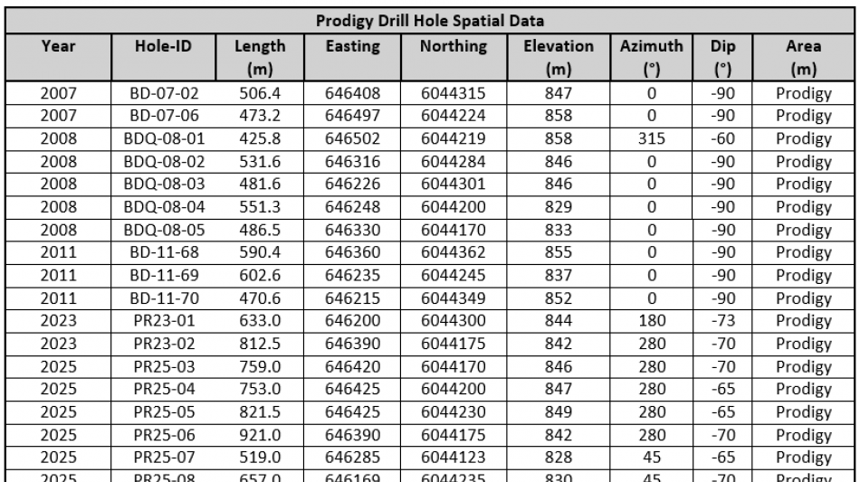 Diamond drill hole PR25-13, the last hole of Phase 3, was drilled to test the west side of a northwest trending magnetic low feature referred to as the Prodigy "EYE" created by pervasive hydrothermal rock alteration and mineralization (see Figure 1). It intersected broad intervals of Au-Ag-Mo-Cu mineralized quartz-ankerite veins and breccia bodies from shallow depths representing a high to intermediate sulfidation epithermal mineral system. Below this Epithermal Au-Ag-Mo-Cu system the hole cut a newly discovered Porphyry Au mineral system continuously over some 340 meters. Highlight intervals from hole PR25-13 included: