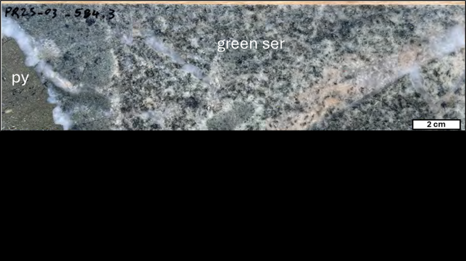 PR25-05 at 623 m - Quartz-monzonite with K-silicate alteration, overprinted by green sericite, and cut by quartz-pyrite veins. This sample represents gold-rich porphyry mineralization and grades 0.92 g/t Au and 6 g/t Ag (from a 2.8 m sample interval).