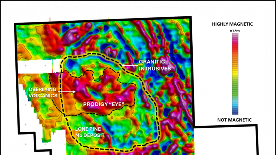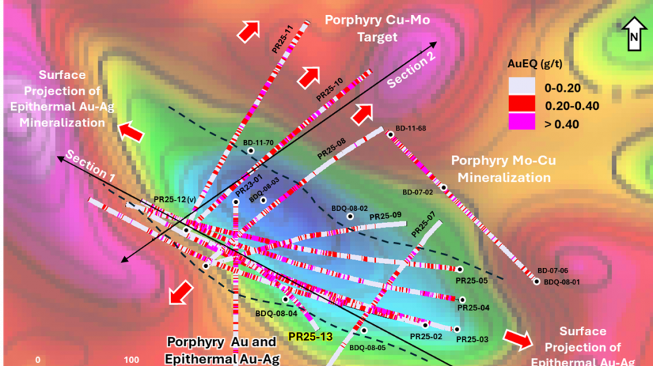Diamond drill hole PR25-13, the last hole of Phase 3, was drilled to test the west side of a northwest trending magnetic low feature referred to as the Prodigy "EYE" created by pervasive hydrothermal rock alteration and mineralization (see Figure 1). It intersected broad intervals of Au-Ag-Mo-Cu mineralized quartz-ankerite veins and breccia bodies from shallow depths representing a high to intermediate sulfidation epithermal mineral system. Below this Epithermal Au-Ag-Mo-Cu system the hole cut a newly discovered Porphyry Au mineral system continuously over some 340 meters. Highlight intervals from hole PR25-13 included: