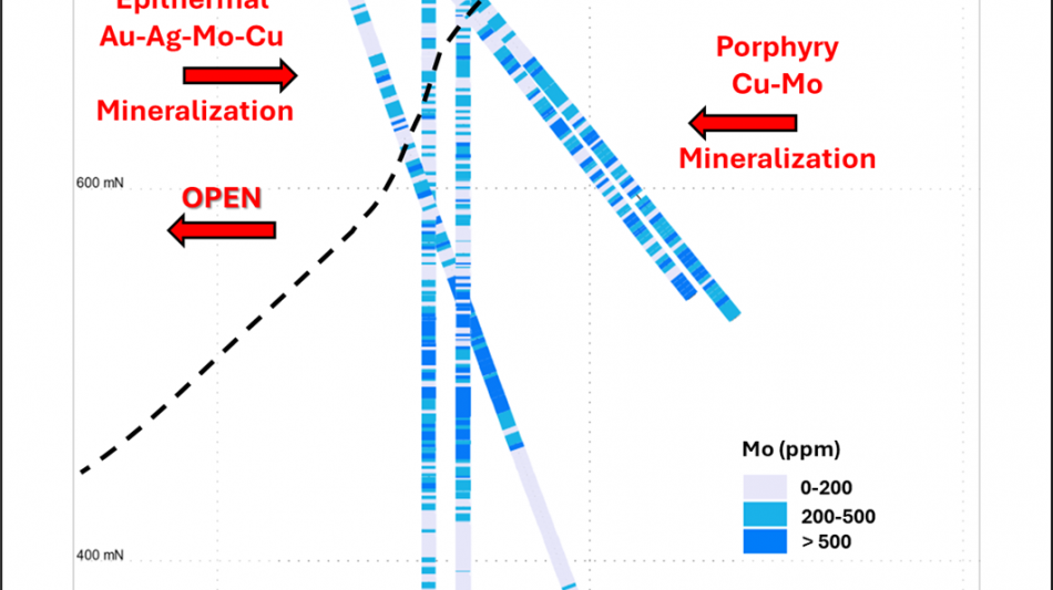 Including 45 m grading 0.26 g/t Au, 44 g/t Ag, 0.008% Mo and 0.08% Cu (0.96 g/t AuEQ*)