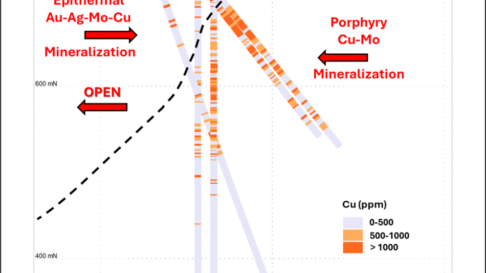 All these holes have intersected Epithermal Au-Ag-Mo-Cu mineralization hosted within earlier deposited Porphyry Mo-Cu mineralization (see Figure 2). In addition, a number of these holes have intersected pervasively altered intrusive rock (quartz monzonite) enriched in gold and classified as Porphyry Au mineralization. Also listed in Table 4 are results from four historical holes located outside to the east of the Prodigy "EYE". These holes intersected a major Porphyry Mo-Cu system which is distinct from the adjacent Prodigy Epithermal Au-Ag-Mo-Cu discovery and Porphyry Au mineralization. Notably, drill holes located at the northeast portion of the "EYE" show increasing copper grades indicating the potential for a Cu dominant porphyry located northeast of the "EYE" (see Figures 2, 5, and 6). The holes with anomalously increasing Cu grades are listed in Table 5.