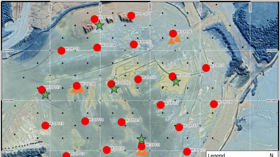 The program included 5 sonic drill holes to recover TSF1 materials for lab testing, 24 holes for Cone Penetration Testing ( CPTu ) and further laboratory testing, and 3 holes each for vein shear testing (VST) and bulk density (BD) testing. Results will inform TSF1 detailed mine design, equipment selection, and operating cost estimates.