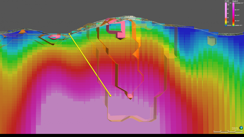 SN-25-001 is designed to test the heart of the target, coincident magnetic and IP chargeability anomalies beneath strong Cu-in-soil trends and mapped copper showings. Hole SN-25-001 will evaluate the relationship between geophysics, alteration, and sulphide distribution at depth (see Figure 2).
