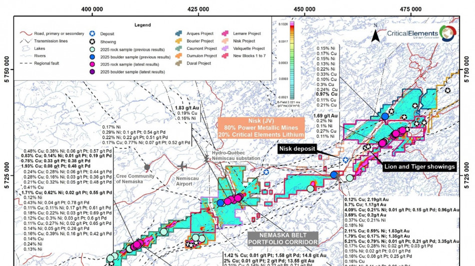 MONTREAL, QC / ACCESS Newswire / November 4, 2025 / Critical Elements Lithium Corporation (TSXV:CRE)(OTCQX:CRECF)(FSE:F12) ("Critical Elements" or the "Corporation") is pleased to announce the latest results from the 2025 summer exploration program completed on Critical Elements' 100%-owned Nemaska Belt properties group, in the Eeyou Istchee region of Québec (Figure 1).